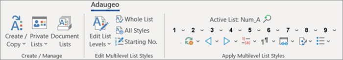 Unlike the 1 to 9 buttons, they are not restricted to the active multilevel list. They operate on any Adaugeo multilevel list style found in the selection.
