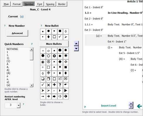Worthy of special note is that you can set any level to be numbered, bulleted, or completely un-numbered.
