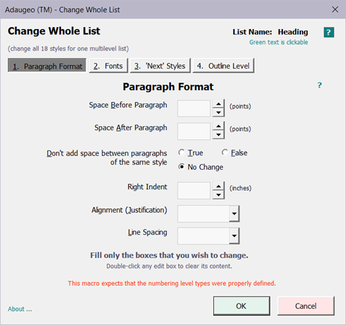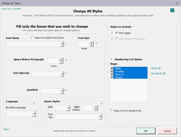 The tool provides an editing interface for all properties normally edited for legal documents. It avoids the very risky practice of editing MLL styles via Word's interfaces.