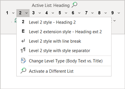 The 1 to 9 buttons apply styles for the "active" multilevel list. The numbers represent levels.