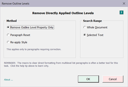 This is a handy tool to have after editing a multilevel list to insert or delete a level. Often that requires also promoting or demoting paragraphs of specific levels.
