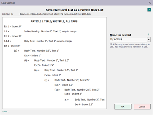 To save any document MLL as a blueprint for future use, simply position the insertion point in a paragraph of the relevant style then run the "Save New Private Multilevel List" tool.