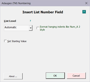We automate the insertion of list number fields to aid users with making the correct choices for the circumstances. Our tool evaluates the conditions at the insertion point and adjusts options accordingly.